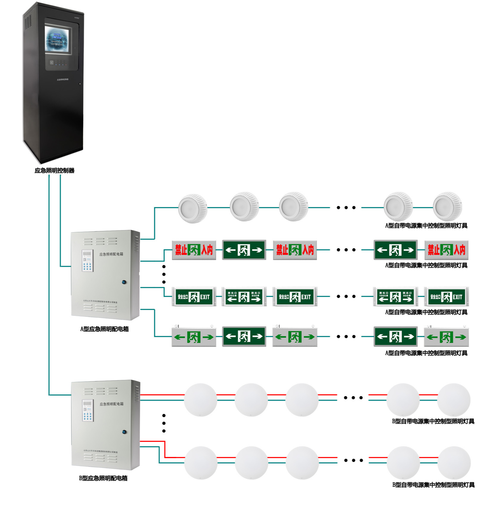 系統由應急照明控制器、應急照明集中電源裝置/應急照明配電箱、集中控制型消防應急燈具等組成。