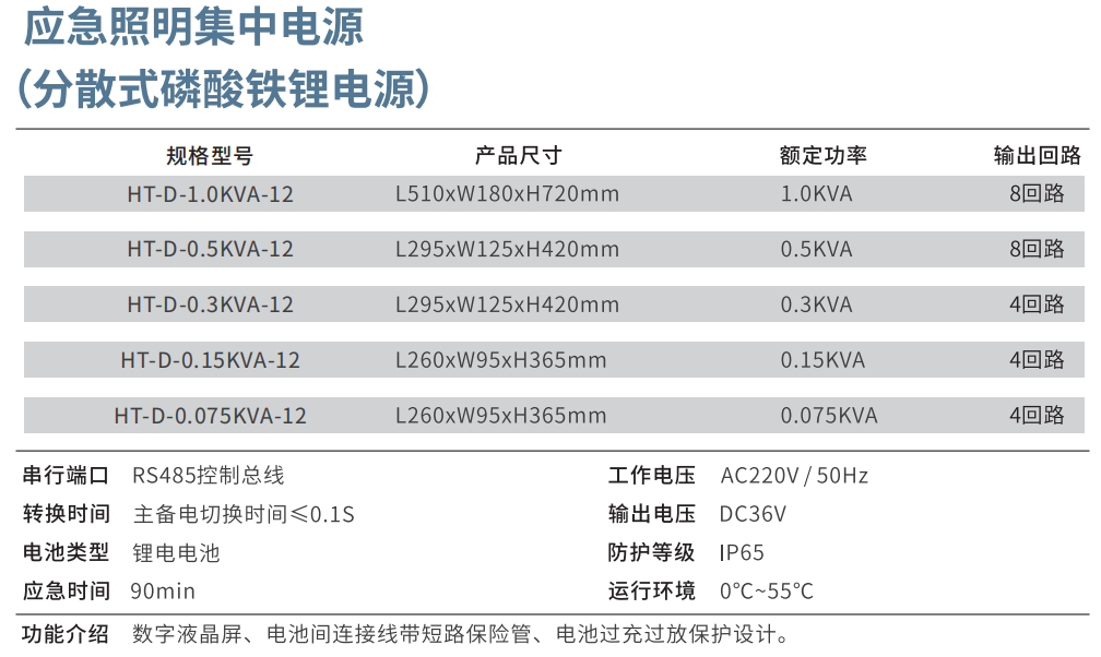 華天應急照明與疏散指示系統分為集中電源集中控制型和自帶電源集中控制型兩種。集中電源集中控制型系統由應急照明控制器、應急照明集中電源、集中電源集中控制型消防應急燈具及相關附件組成。每臺電源標配8個回路,A型電源每個回路電流≤6A,B型電源每個回路電流≤10A。